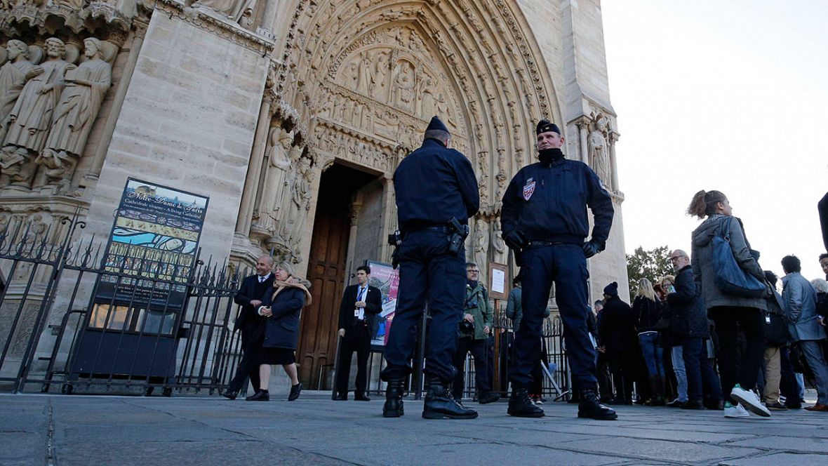 Dos policías franceses patrullan junto a la catedral de Notre Dame, en París.